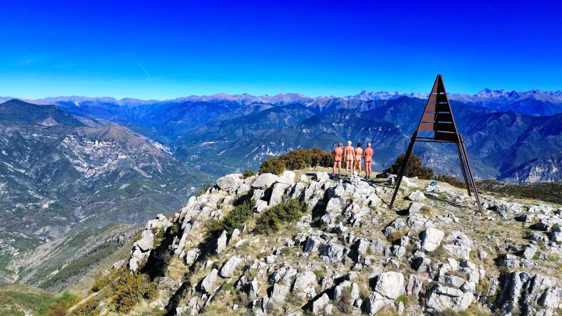 Un petit tour vers les antennes à l’est ; un salut naturiste aux caméras de surveillance, une vue superbe sur la vallée du Var et sur les montagnes qui annoncent l’Italie. Puis nous revenons vers les antennes de l’ouest où se trouve une pyramide de métal signalant le vrai sommet du Vial. C’est l’heure du déjeuner, de prendre quelques photos et de faire voler mon drone.