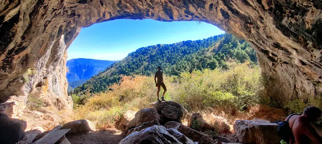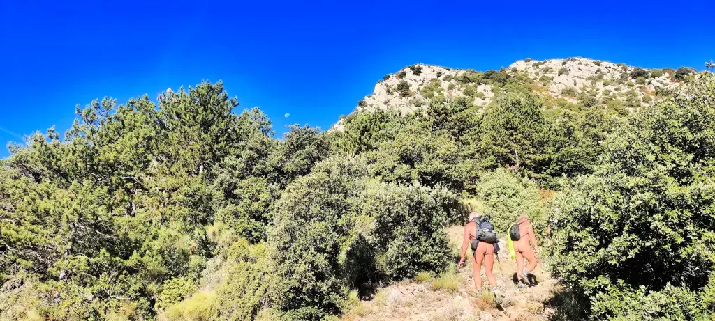 Soudain, une volée de jeunes filles nous chasse du sommet et nous entamons notre descente sous un bon soleil et dans une chaleur presque estivale. La randonnée devient textile par intermittence. À l’aller, nous étions seuls et nus, mais au retour, le pagne n’est jamais loin tant nous croisons du monde : randonneurs, chasseurs, promeneurs de chiens, personnes isolées. Des sourires et de la bienveillance, pas d’incident. Une pause dans une grotte accueillante et fraîche où nous prenons quelques photos. Puis nous reprenons le chemin qui descend bien, parfois un peu vite. Les paysages sont toujours somptueux.