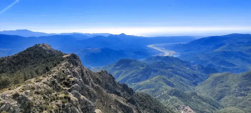 Nous entamons notre montée sous un soleil déjà un peu chaud. Le paysage est magnifique, le temps est très clair : on voit le Var s’écouler dans sa plaine vers la mer au loin, les villages accrochés à mi-pente. Puis nous changeons de versant et observons le Var qui s’extrait des gorges où il se mêle à la Vésubie. Nous ne croisons personne. À un col, nous apercevons le sommet et ses antennes. Un dernier raidillon et nous atteignons une route entre les antennes avec deux voitures garées. Nous croisons même une troisième voiture avec trois hommes venus admirer la vue sans le plaisir de la balade.